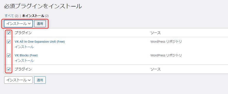 「VK All in One Expansion Unit (Free)」にチェックを入れ、下の「インストール」をクリック。