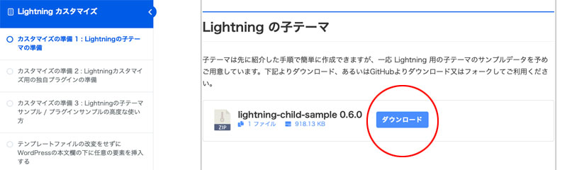 下記にアクセス後、「Lightning の子テーマ」の「ダウンロード」をクリック。