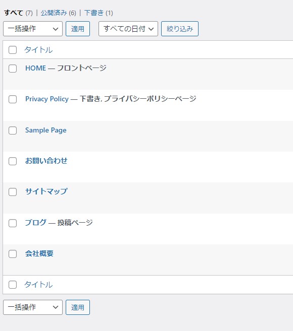 固定ページの中身は後で作成するとして、ページのタイトルはここで修正します(メニュー設定のため)。