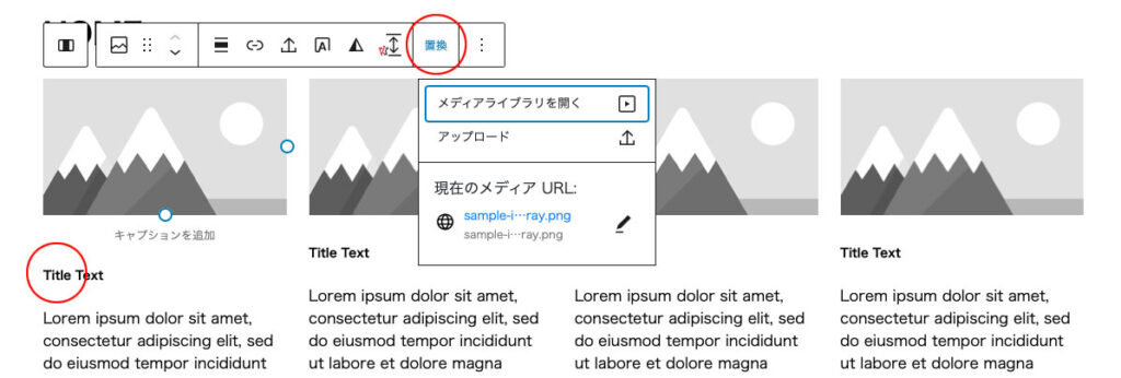 画像を変更する場合、画像をクリックし、「置換」をクリックし、ライブラリの画像を選択する場合は「メディアライブラリを開く」、新規にアップロードする場合は「アップロード」を選択。