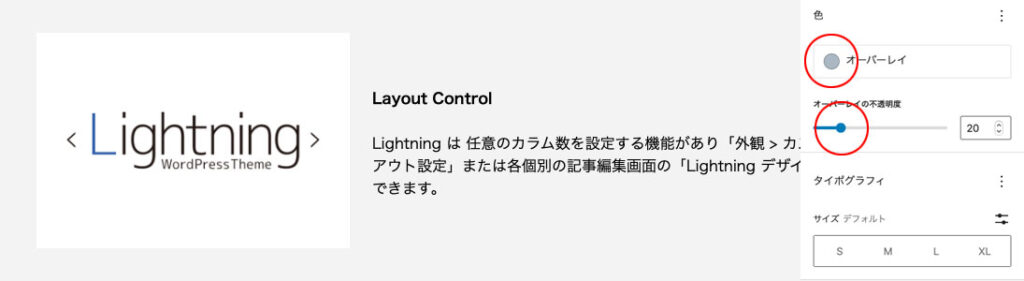 背景の色を変更する場合は右側の「色」の下の「オーバーレイ」の丸をクリックし変更でき、「オーバーレイの不透明度」で変更もできます。