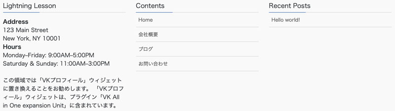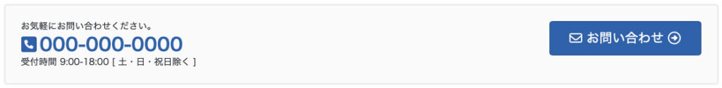 管理画面「外観」>「カスタマイズ」>「ExUnit」設定>「お問い合わせ情報」で入力された内容が各固定ページ下部や『お問い合わせ情報』ウィジェット、『お問い合わせボタン』ウィジェットなどに反映されます。