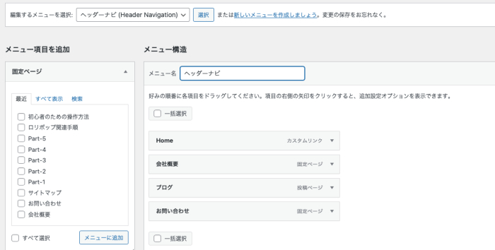 管理画面左側「外観」>「メニュー」>「ヘッダーナビ」を選択、名前を「Menu-1」など、メニュー項目を追加します。
