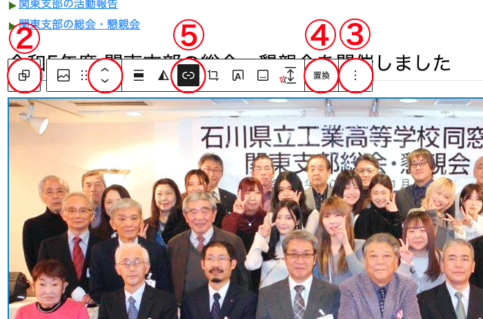 また、不要の写真をメディアライブラリーに置いたままも容量が足りなくなり、アクセスも遅くなります。 - 拡大して見せたい場合は⑤をクリックし「画像ファイルへのリンク」を選んでください。